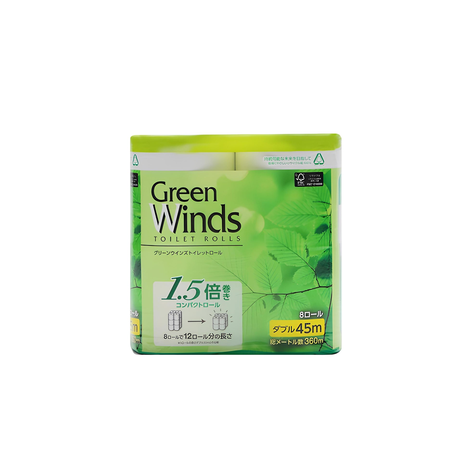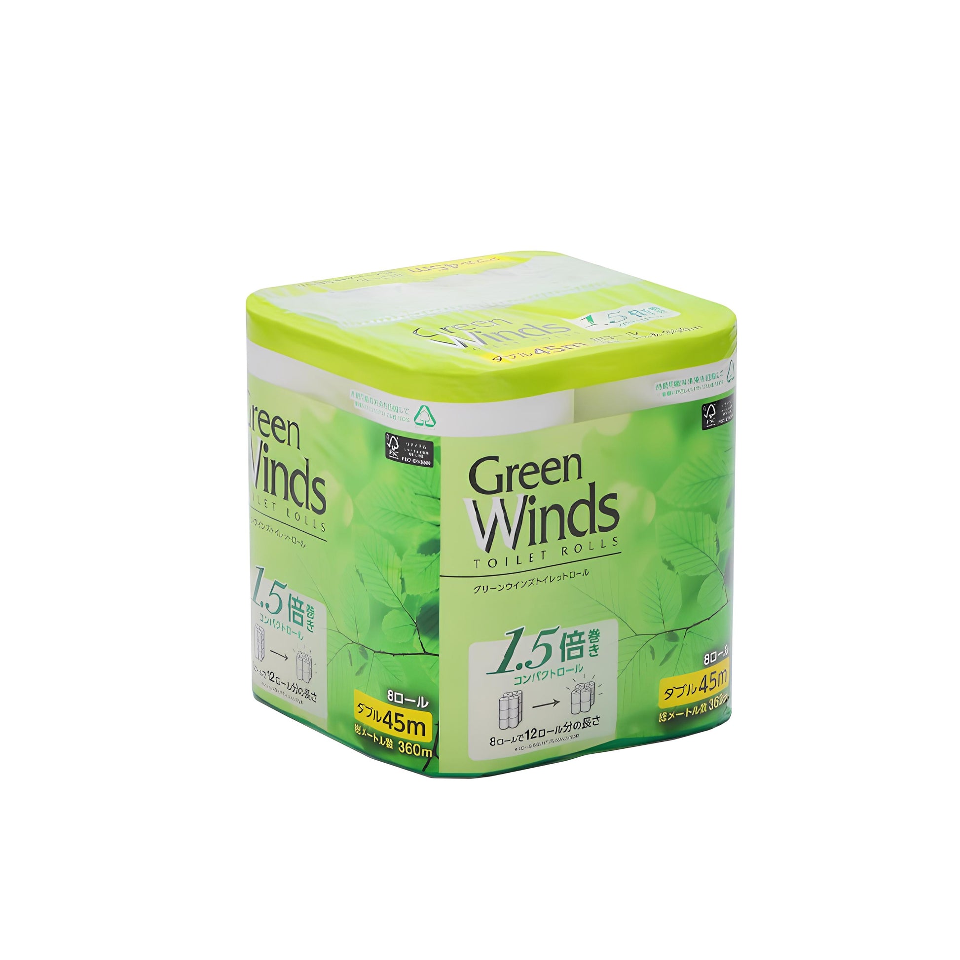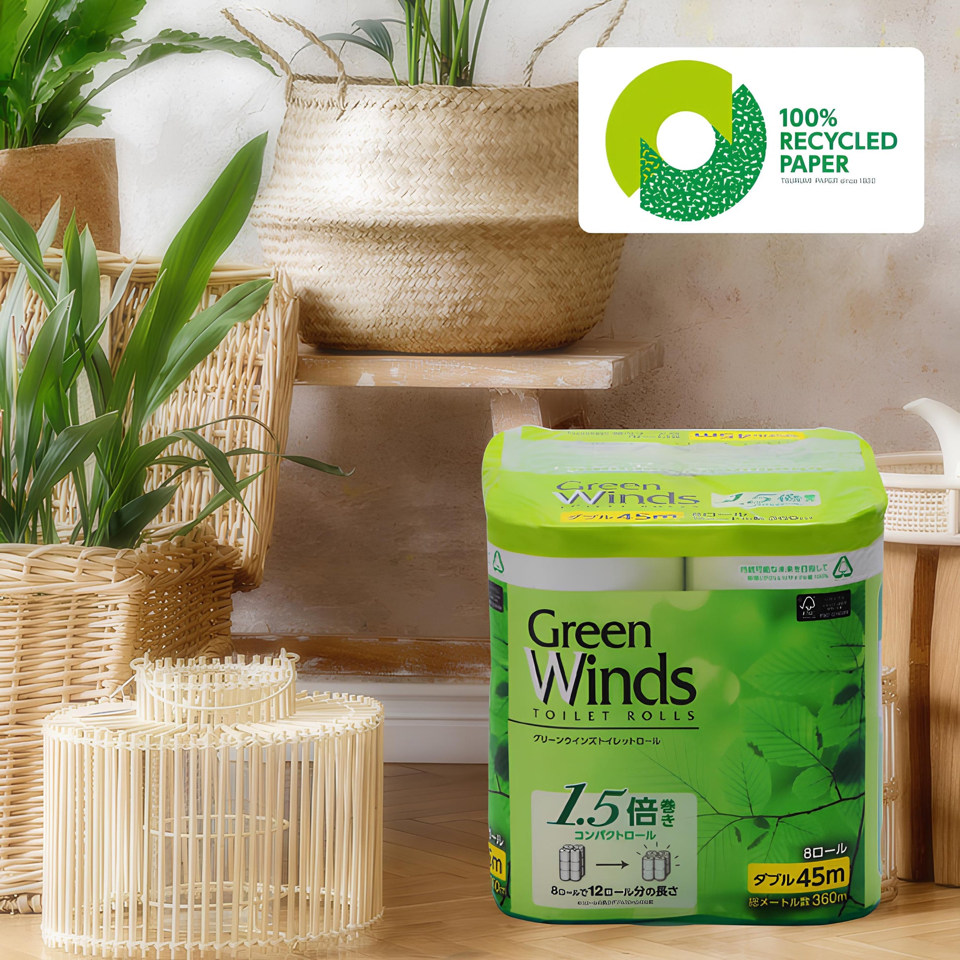 トイレットペーパー グリーンウインズ 1.5倍巻き ダブル 8ロール×8パック 無香料 45m 再生紙100%