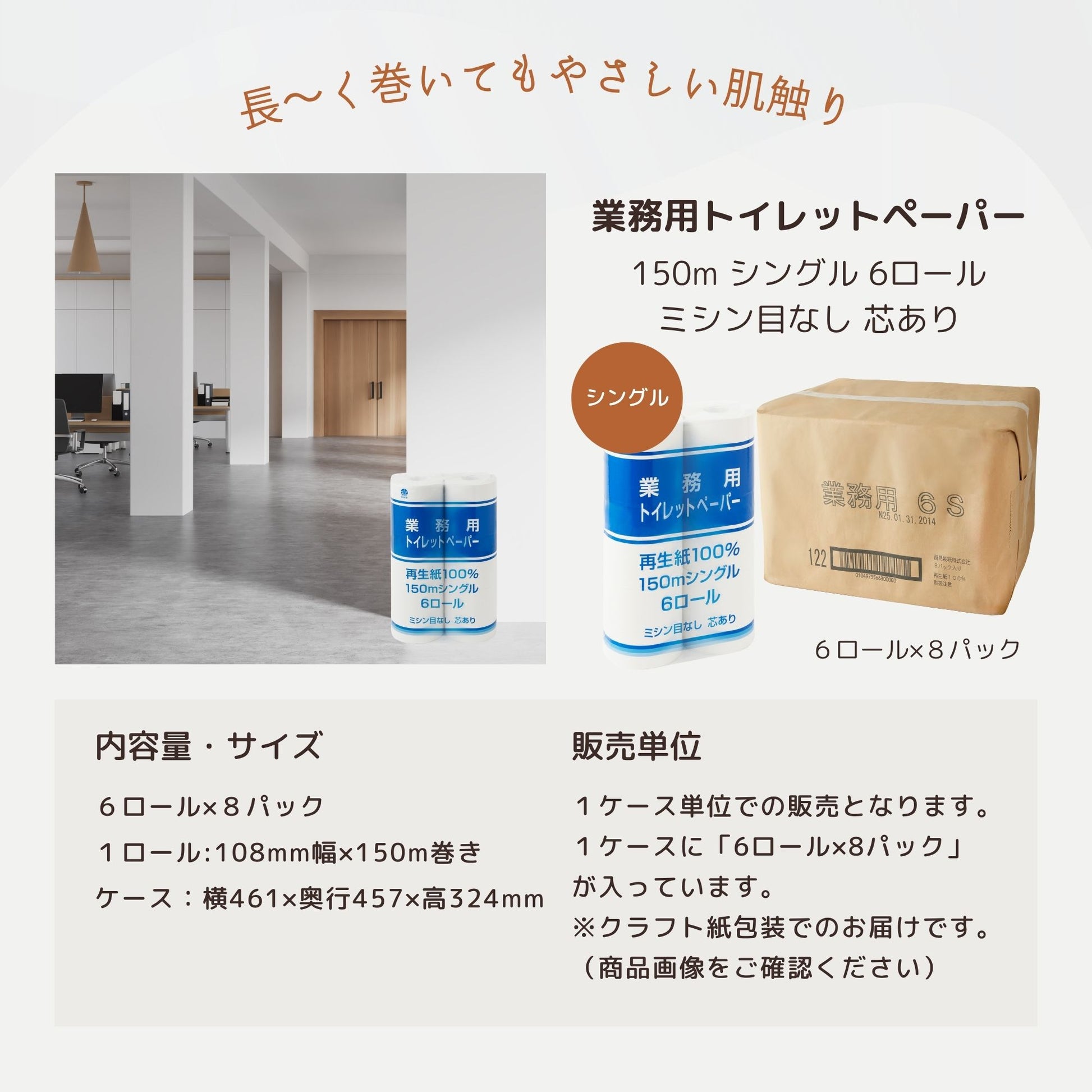 トイレットペーパー 業務用 シングル 6ロール×8パック 無香料 150m 再生紙100%